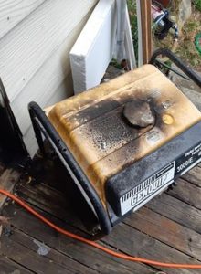 By now, K’s sloshed so much water that she’s drowned the flames and Gg ‘s able to drag the generator out of the shed, so its out in the open. Only the shed door is burning. K sloshes more water, so its just singed. The generator is also singed, and dead.